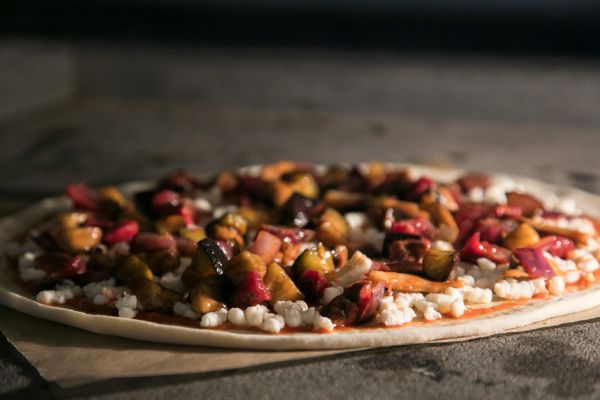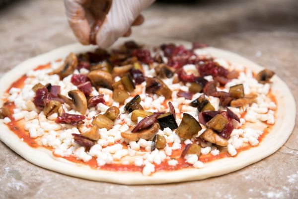Приготовим тесто. Смешать воду, дрожжи, 3 мл оливкового масла, 1г сахара, 2г соли, муку пшеничную и семолу, замесить тесто. Накрыть полотенцем, дать постоять 30 мин.