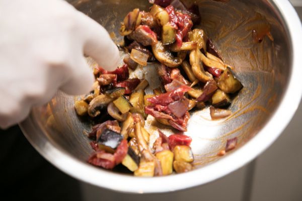 Смешать баклажаны, грибы и красный лук, говядину с чесночным маслом, соусом Барбекю и черным перцем.