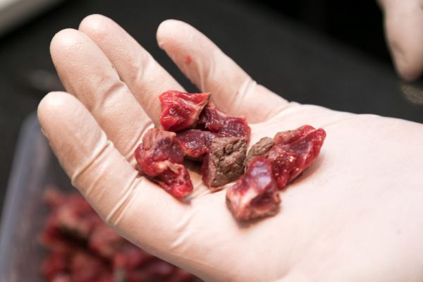 Говяжью вырезку слегка обжарить до придания цвета на сковороде, нарезать мелким кубиком.