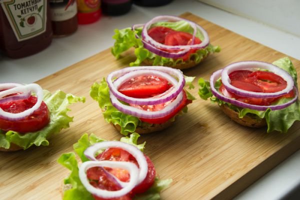Сборка! На булочку кладем лист салата, помидор и лук. Лучше всего в таком порядке, мясо чуть нагреет лук и он станет намного вкуснее. На овощи выкладываем свинину, капаем соусом, кладем бекон и еще раз капаем соусом. Кстати, соус хорошо бы попробовать перед употреблением, он может показаться довольно ядреным. Накрываем верхней частью булочки и всё