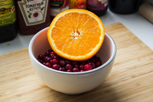 Займемся соусом. Тут конечно фотография не очень нужна, но мне просто очень понравился апельсин. Даже в самой суровой душе викинга, найдется место красоте! В кастрюльку с толстым дном насыпаем ягоду, можно ее даже не размораживать. Наливаем воду (3 ст.л) и насыпаем сахар (3 ст.л), отправляем все это на средний огонь.