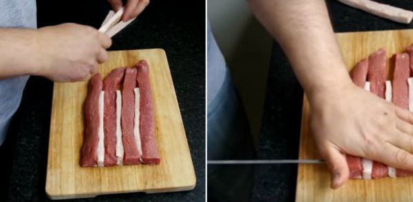 Вырезку нарежьте на 21 полосу, по 7 на одну бешпанджу. Полосы должны иметь длину по возрастающей: от 10–12 до 20 см. Толщина полос – около двух сантиметров, приблизительно такая же ширина.