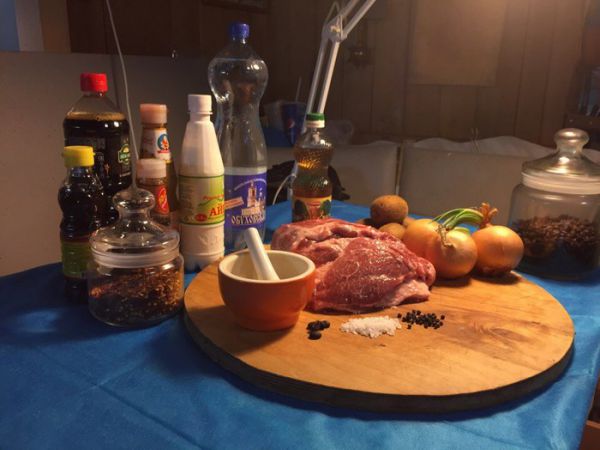 Для готовки я брал стакан воды, размешивал с небольшим количеством яблочного уксуса и заливал в мясо. Когда насаживал, заметил, что мясцо потемнело и достаточно сильно.