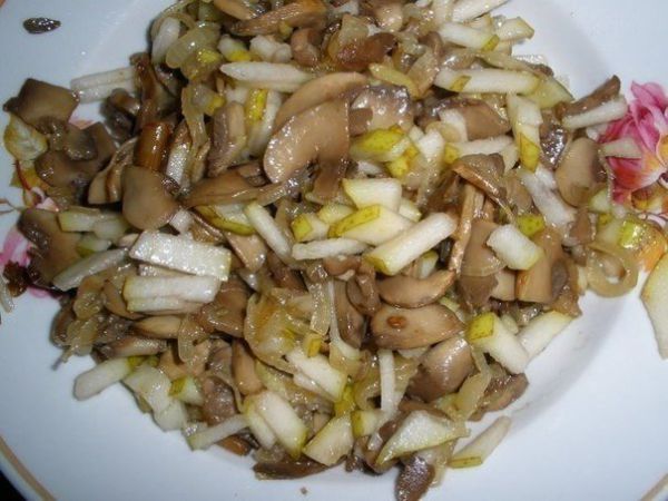 Лучок обжариваем до прозрачности, присоединяем грибы, тушим 10 минут. Остужаем. Добавляем грушу, все хорошо перемешиваем.