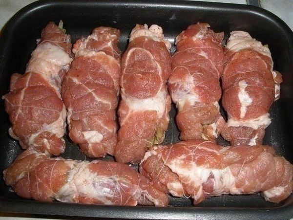 На кусочек мяса выкладываем немного начинки, ломтик сыра и сворачиваем в рулетик, перематываем ниткой или можно сколоть зубочистками.