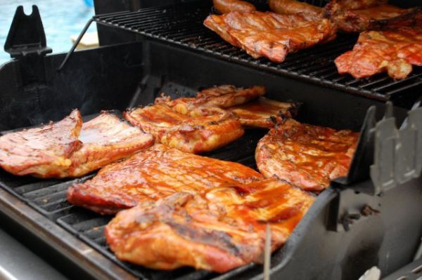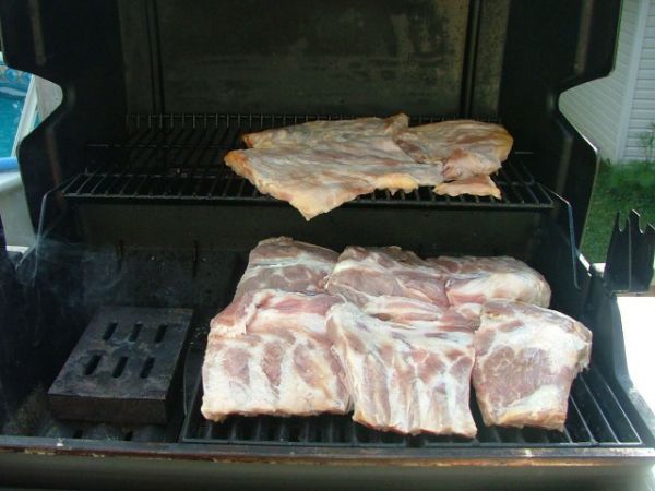 На другой день - пятницу часа в 2 дня я распалил свой гриль, наладив его на копчение – коробку с опилками на крайнюю горелку, под две другие решетки противень с водой. Выложив мясо на решетки, коптил их при температуре 200F (93С) 4 часа.