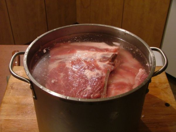 Гости собирались в пятницу часам к 6. Поэтому накануне я бросил мясо в рассол, перед этим разрезав каждый кусок на 3 части. Мне понадобилось 4 литра воды, 6 ст. ложек соли и 2 ст. ложки сахара. Самое трудное в этом блюде оказалось найти место в холодильнике, для такой кастрюльки.