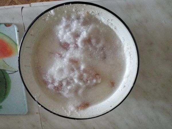 Ставим нашу посуду с грудками в холодильник на сутки. Через сутки смываем соль, далее вымачиваем 4 часа, каждые 30-50 минут меняя воду. Потом обмакиваем слегка салфетками, чтоб вода не текла.