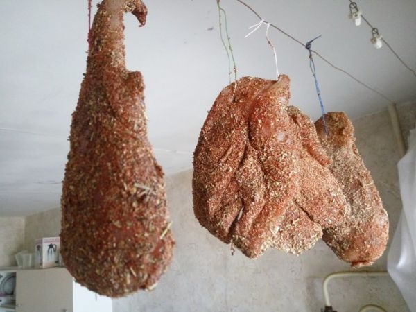 Подвешиваем наши грудки сушится при комнатной температуре на трое суток. Я повесил на кухне.