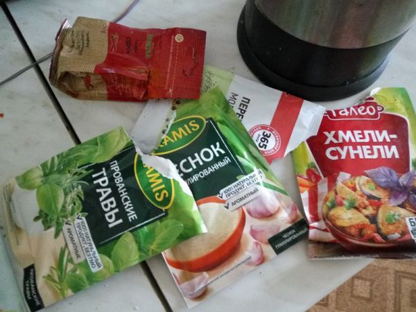 Соль каменная, около кило, различные специи (кориандр молотый, перец черный, красный острый, чеснок гранулированный и т.д.) Тут на свой вкус смотрите. Кому что больше нравится.