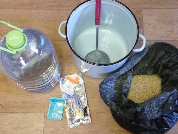Вода в баклахе из магазина, 5л. В этой же баклахе будете сбраживать пиво. Воды понадобится еще примерно пара литров кроме этих 5: на доливку и промывку.