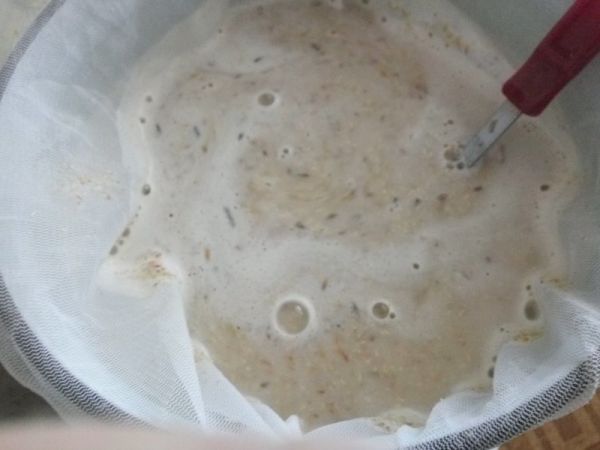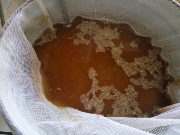 Далее можно осторожно поднять мешок с солодом, поместить его в дуршлаг над кастрюлей с суслом и промывать дробину оставшимся литром воды. Но, как правило, мешок не влезает в дуршлаг или сусло будет еще и мимо течь. Второй вариант - из мешка шумовкой выкладывать солод прямо в дуршлаг и промывать водой сверху. Третий вариант – переместить мешок с солодом в кастрюлю с промывной водой, дать настояться минут 15, перемешивая шумовкой, и слить к основному суслу. Я объединяю второй и третий варианты.