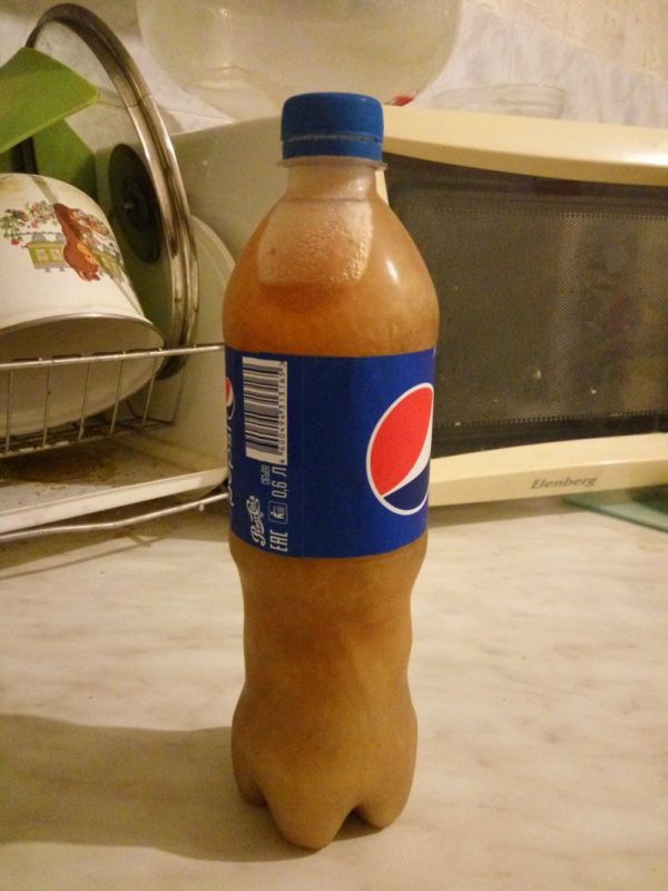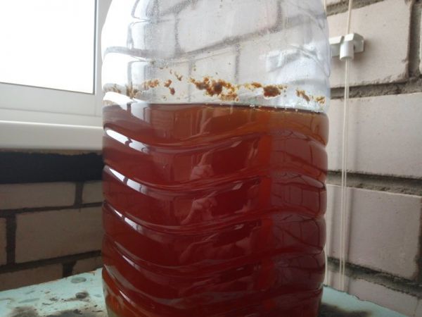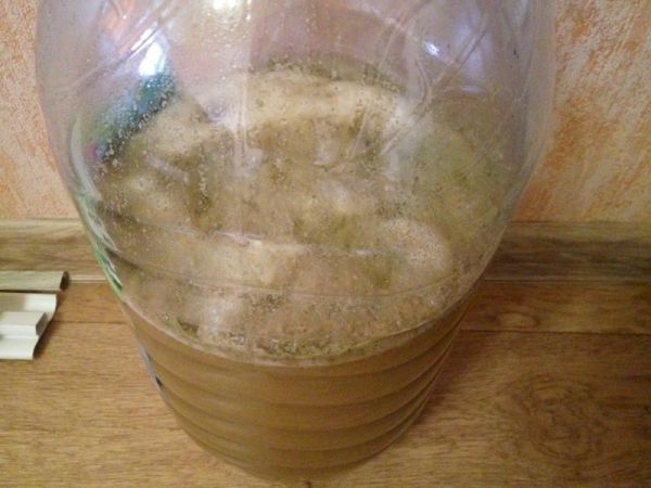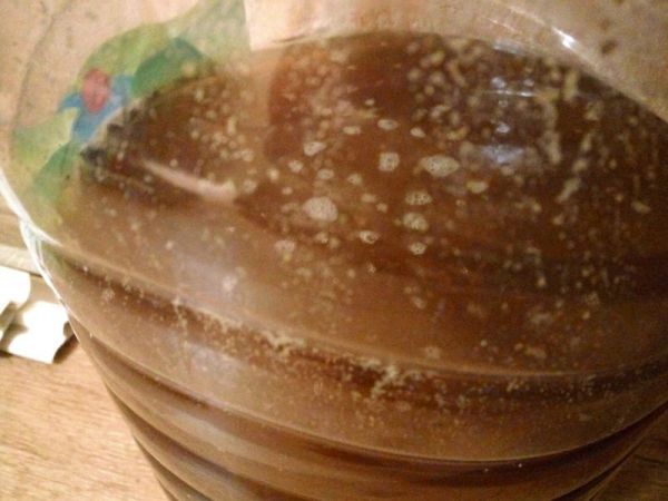 Охладив сусло до 26-28*С, его нужно перелить в 5 литровую бутыль из под воды, которую мы покупали. Желательно перелить аккуратно, чтобы осадок не попал в бутыль, но это довольно затруднительно. Так что не пугайтесь, если у вас будет много осадка, это не критично. Можно, конечно, долго и нудно фильтровать через марлю, сито или что-то еще, не забывая про дезинфекцию, но проще слить большую часть сусла с осадком, а около полулитра с хмелем и брухом вылить. Засеять дрожжи. Не сыпьте всю пачку! Её одной вполне хватает на 3-4 варки под мои 12 литров, а если меньше, то и все 5-6. Сыпаните чуть-чуть, буквально четверть чайной ложки (стерильной!) Закрутите крышку, затем ослабьте ее так, чтобы смогли выходить газы при брожении. Оставьте бутыль в темном месте при комнатной температуре на сутки. Через сутки поставьте в темное прохладное место. Температура брожения должна быть примерно 18-20*С (если нет такого места, просто найдите темное место где-нибудь в кладовке). Я ставлю баклаху в ведро с холодной водой и закрываю в кладовке. Воду меняю 2 раза в сутки, сейчас правда отопления нет, и пиво бродит при 20-21 градусе уже без охлаждения водой. Сначала появятся "островки" пены на поверхности. Затем пена будет шапкой. Будет ли бурное брожение, зависит от штамма дрожжей. Это говорит о том, что брожение идет нормально. Примерно через день-два пена спадет, и будет идти уже спокойное брожение, через некоторое время пиво осветлится.