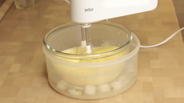 Смешать яйца с сахаром, ванильным сахаром, цедрой и апельсиновым соком.