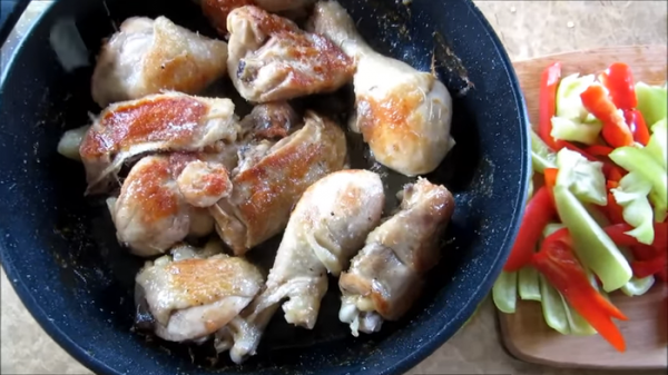 Делим мясо на порции, куски средней величины. Немного оливкового масла разогреем на сковороде, отправим туда чеснок. И как только пойдет чесночный аромат, выкладываем курочку. Обжариваем курицу на сильном огне, в течении 5-7 минут. Периодически переворачивая, что бы все соки запечатались! После чего уменьшаем нагрев плиты до минимума, добавляем вино и воду, накрываем крышкой. И тушим минут 30-40.
