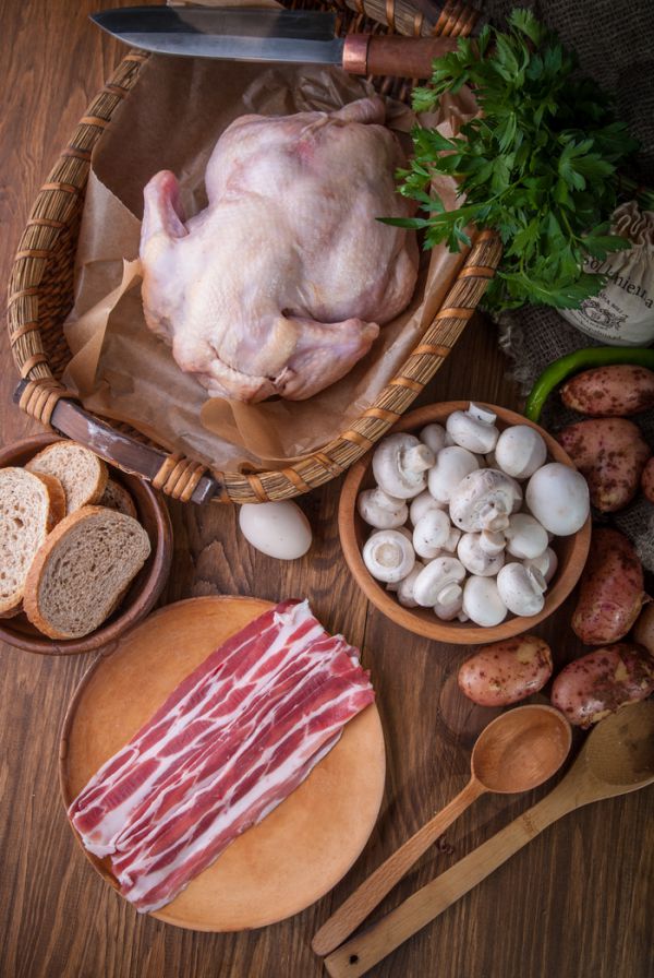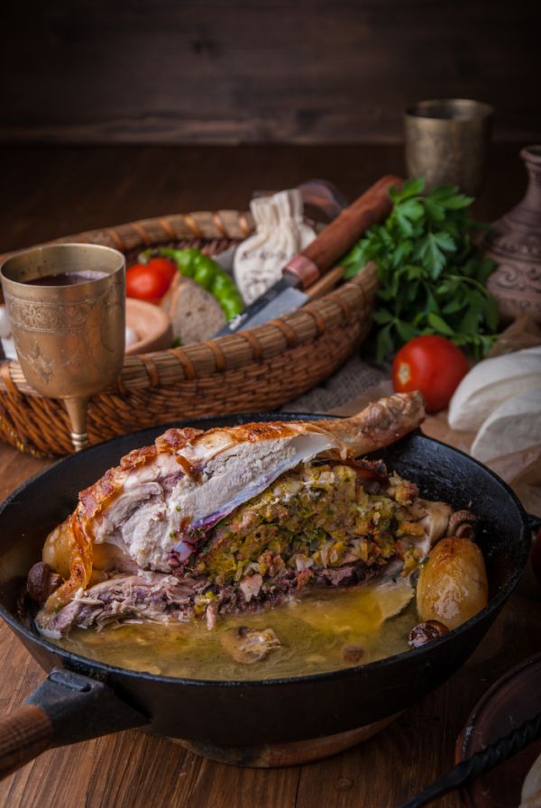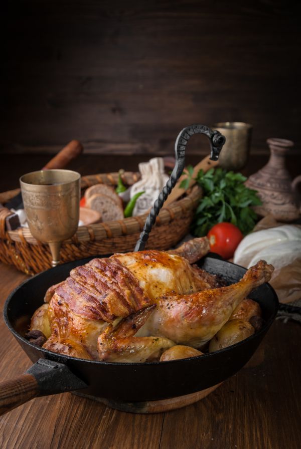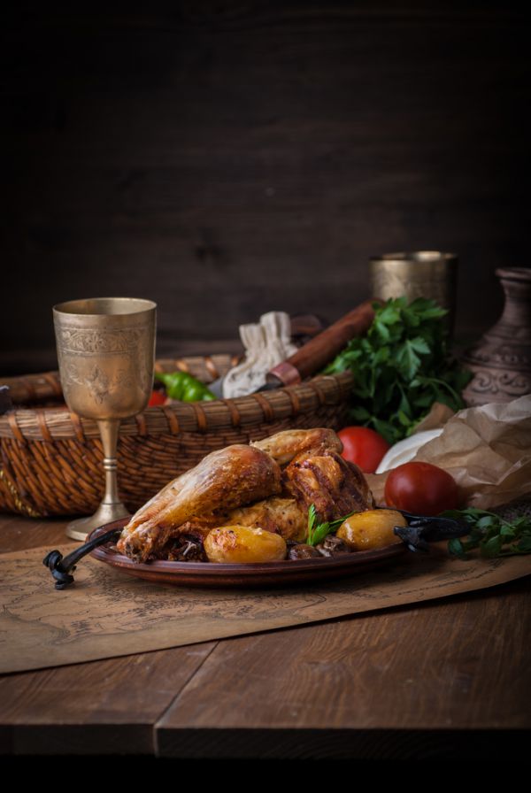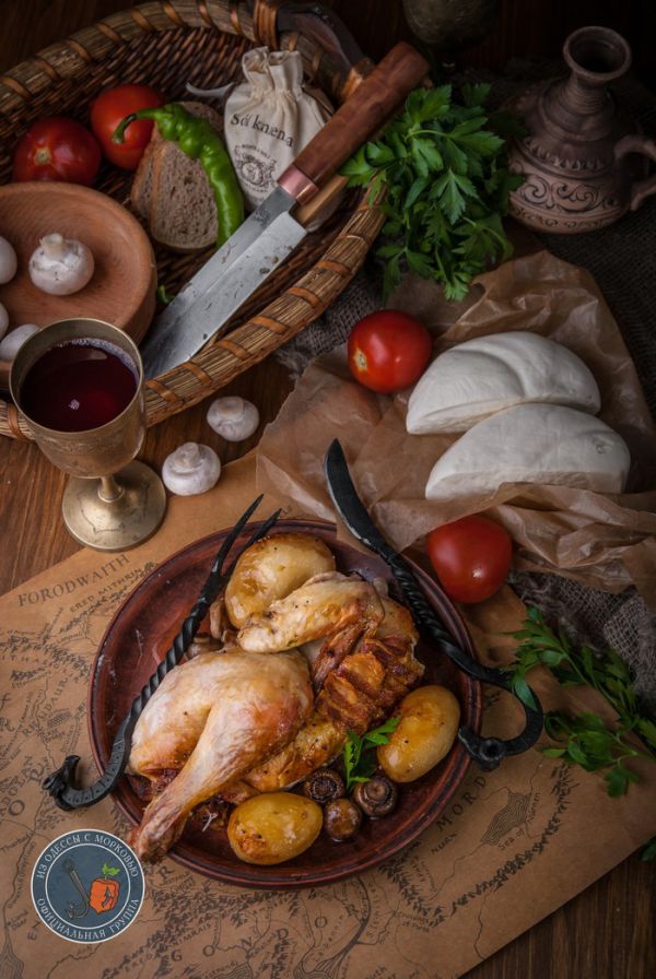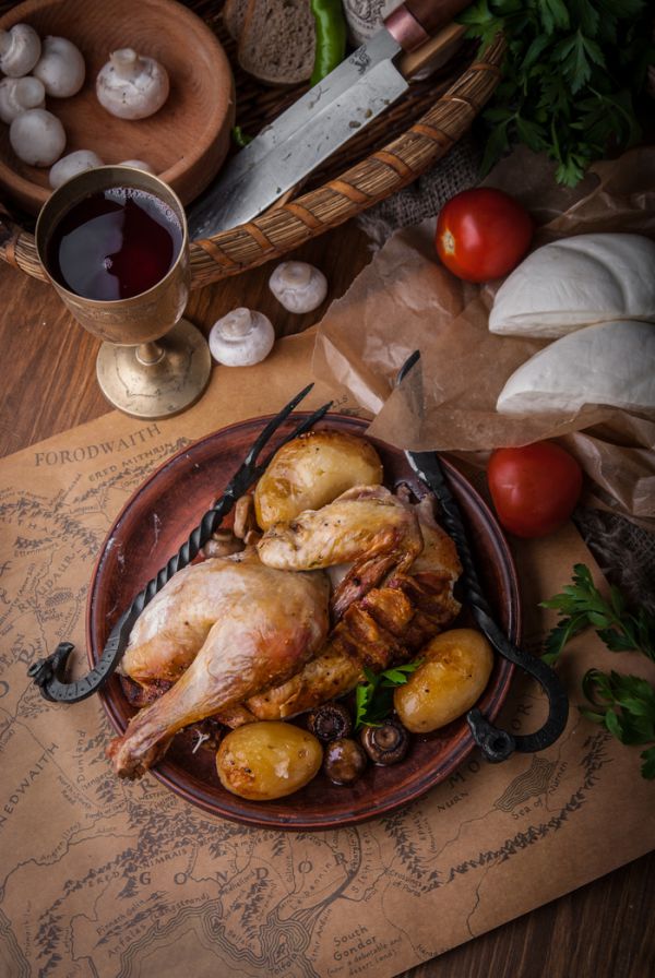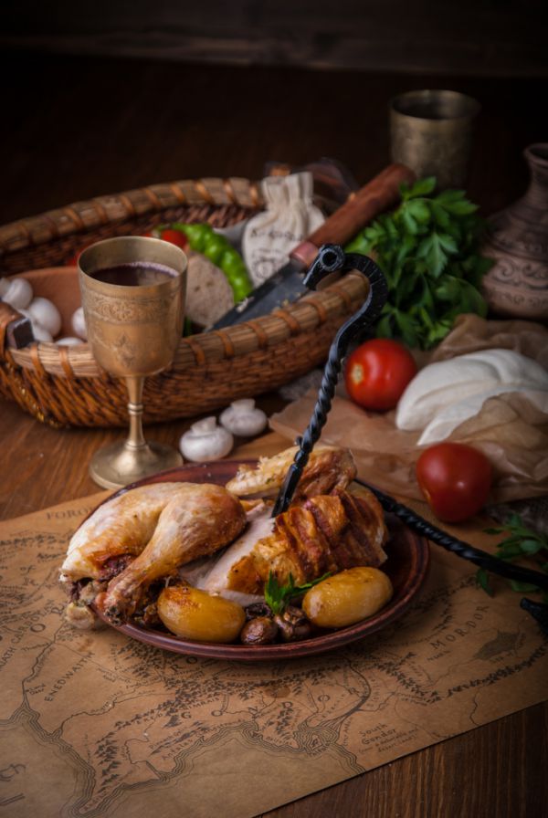 О пристрастии хоббитов к вкусной, сытной еде известно многим. И в основном это разнообразное мясо, рыба и множество овощей. Любят они и похлебки, блюда, включающие тушения и томления.Я уже не говорю про различные коренья, пряности и травы. Короче, эти волосатые чуваки явно могут во вкусную и сытную еду. Дабы не перегружать блюдо лишними компонентами- курицу можно укомплектовать овощами.