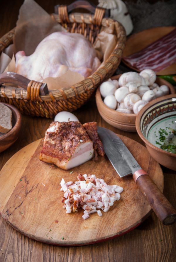 - небольшой кусочек копченой щеки. Заменять копченым подчеревком, беконом, грудинкой и т.д.
