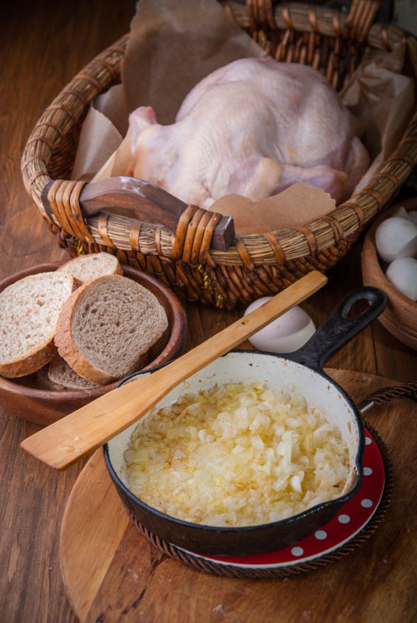 - Переложить поджаренный лук с маслом в подходящую емкость и добавить порезанный кубиками хлеб и копченые щеки (бекон,грудинку или что там у вас), нарубленную петрушку, размешанное сырое яйцо. Слегка можно посолить и приправить черным перцем. Перемешать.