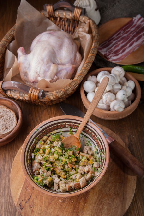 - Начинить всем этим счастьем курицу. Без фанатизма. Если начинки будет больше, прошу вас, не делайте курице страшно. Я оставшуюся начинку тут же, превратил в яичницу, залив ее парой яиц- получилось душевно, ибо, как не говорил Конфуций- тот, кто познал вкус яичницы со шкварками по утру- познал вкус жизни.