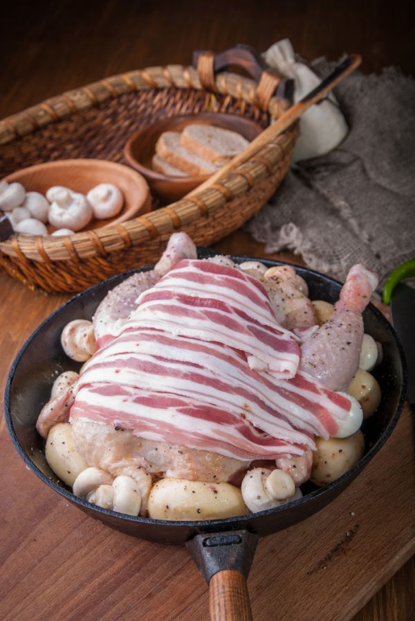 - Если полоски бекона, предназначенные для помещения на курицу, у вас попались сверхтонкие, то где-то в середине готовки их можно убрать, чтобы не превратились в чипсы. У меня мясо было сырым и жирным, поэтому я не убирал.