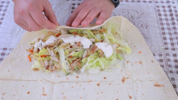Настало время собрать шаурму. В моём случае листы лаваша оказались излишне большими, поэтому я разрезал их на 2 части. На каждую из частей наносим по 2 столовые ложки соуса, куриное мясо, огурец, помидор, морковку “по-корейски”, салат айсберг, ещё один слой куриной грудки (ведь все мы знаем, что мяса много не бывает), ещё 2 столовые ложки соуса (для того, чтобы шаурма получилась действительно сочной). Сворачиваем лист лаваша, придерживая начинку так, чтобы у нас получился аккуратный рулет.