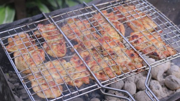 Обжариваем курицу на углях. Разрезаем бедра на небольшие кусочки, чтобы их удобно было заворачивать в шаурму.