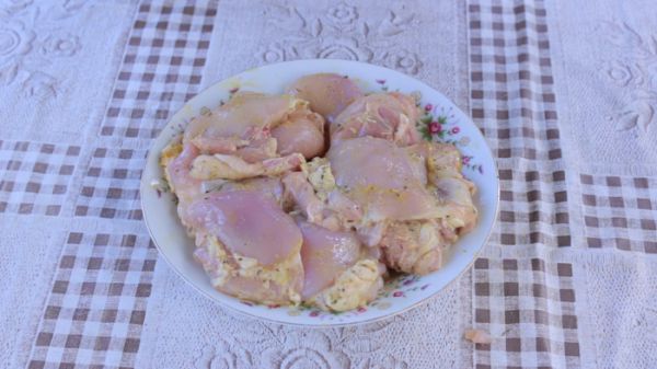 Начинаем приготовления с того, что замаринуем куриные бедра при помощи соли, черного молотого перца, сухого чеснока, сушеного базилика, куркумы и сока половины лимона. Как следует, перемешаем ингредиенты и оставим мариноваться на полчаса.