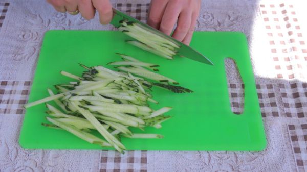 Огурцы нарезаем соломкой. Помидоры избавляем от плодоножки и нарезаем полукружками. На произвольные, не очень крупные кусочки нарезаем салат айсберг.