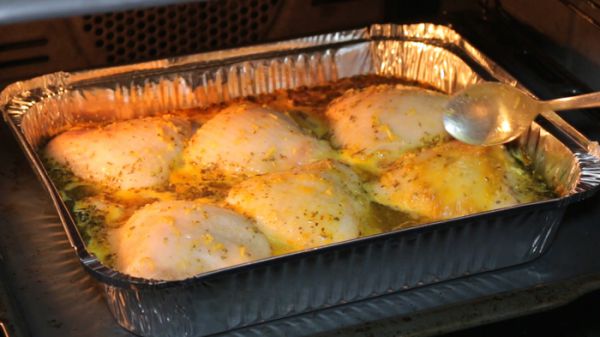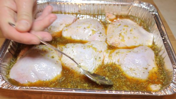 Помещаем противень в духовой шкаф, разогретый до 180 градусов на 1 час. Каждые 20 минут при помощи ложки поливаем бедра остатками маринада.