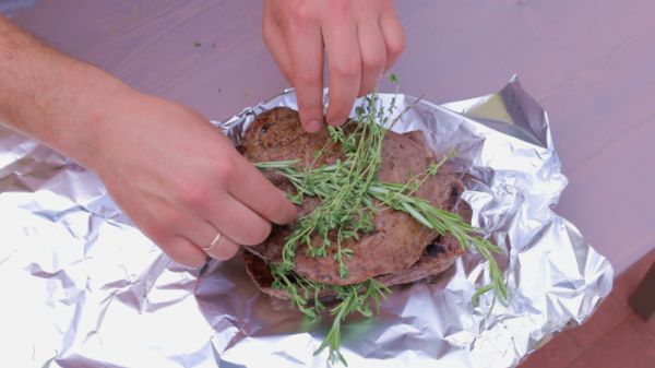 Снимаем стейки с огня. Кладем на фольгу. Добавляем розмарин, тимьян. Заворачиваем стейки в фольгу и даем отдохнуть в течение 5 минут. Именно в это время температура внутри у них дойдет до желаемых 55 градусов.