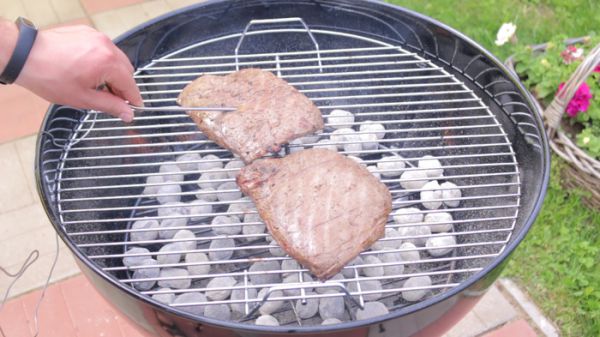 Выкладываем стайки на гриль и обжариваем по 3 минуты с каждой стороны. Моя цель прожарка медиум рер (medium rare), по этому температура внутри стейка должна быть в районе 55 градусов. Переворачиваем стейки и оставляем их ещё на 3 минуты. При помощи кулинарного термометра измеряем температуру внутри стейка. Она должна быть на несколько градусов ниже желаемой.