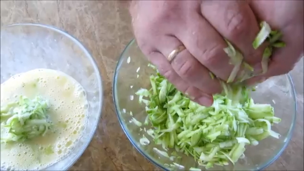 Кабачки молодые, натираем на крупной терке вместе со шкуркой. В яйца добавляем щепотку соли (сыр, ветчина соленые, так что с солью поаккуратней) и хорошо перемешиваем. Кабачок отжали и отправили в чашку с яйцами.