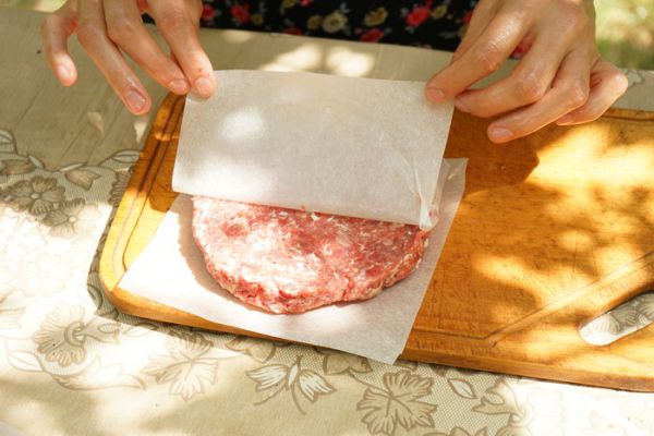 2. В фарш добавляем соль и черный молотый перец, перемешиваем и формируем котлеты. Я это всегда делаю на пергаменте, тогда легче их переносить на гриль или на сковороду. Котлета должна быть слегка больше, чем сама булочка, потому что при жарке она уменьшится.