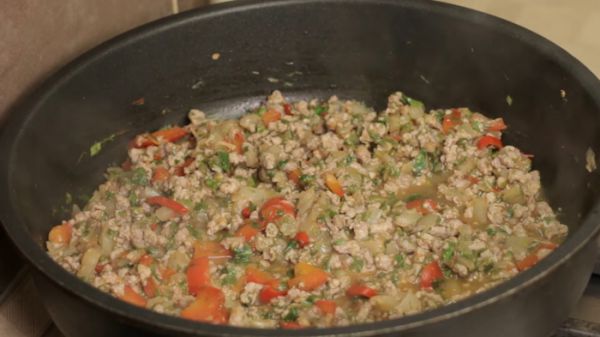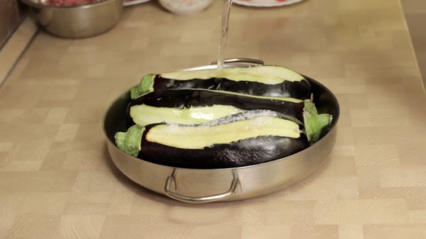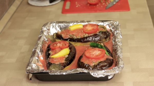 Достать баклажаны и выложить фарш во «вспоротые животики».