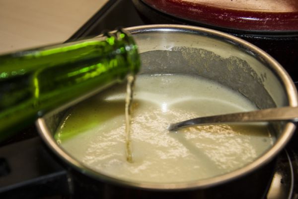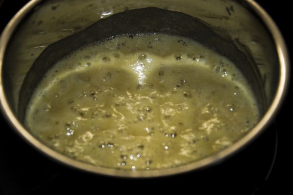 ТОНКОЙ струйкой вливаем в мучную смесь пиво и тоже хорошо все промешиваем, если взять и щедро ливануть пивка, то оно убежит из сотейника.