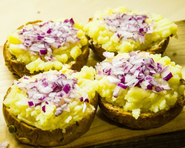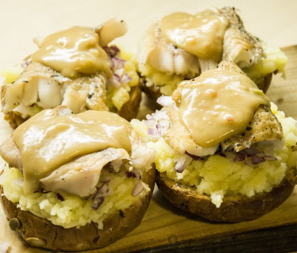 Всё! Рыба закоптилась, картошка помята, лук нарезан, начинаем сборку.