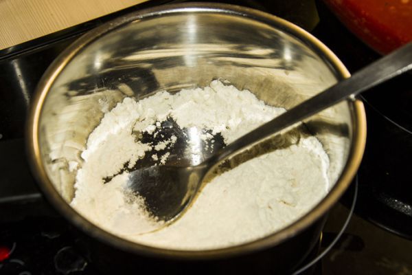 В сухом сотейнике на среднем огне немного поджарим муку, ориентироваться надо на блинный запах (хз, почему его ореховым называют) и цвет муки, она должна чуть-чуть потемнеть приобретя красивый кремовый цвет.