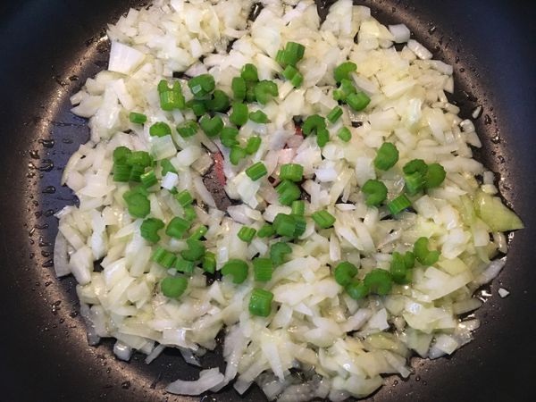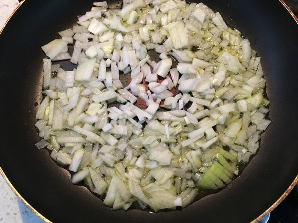 Затем в сковородку (а лучше в сотейник, но его у меня нет) добавим две столовые ложки оливкового масла и хорошенько разогреем, после чего выкладываем лук, который обжариваем 1-2 минуты.