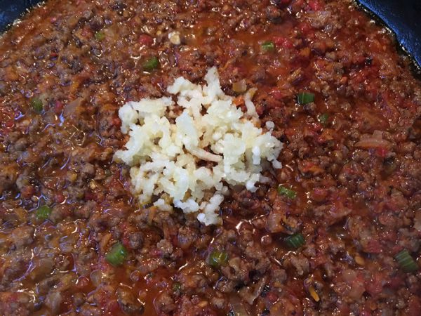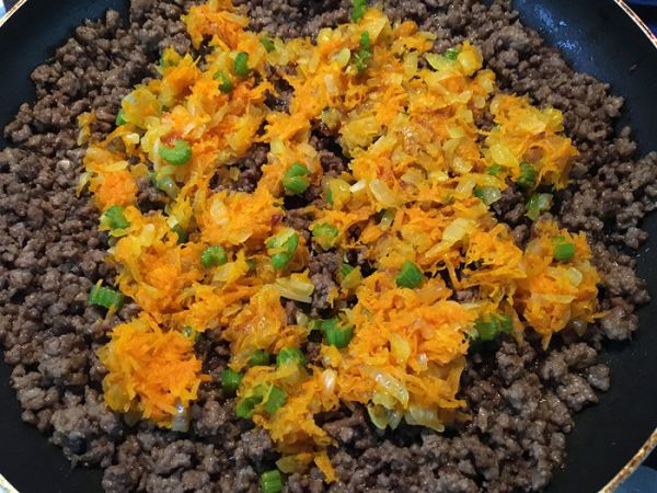 Спустя примерно 15 минут фарш подрумянится и самое время добавить в него соффито и хорошенько перемешать и оставить на минутку на маленьком огне.