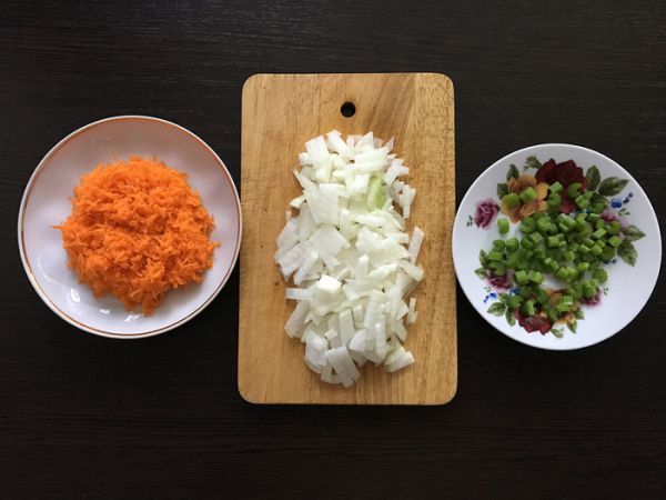 Для начала нарежем мелко лук, сельдерей, а морковь натрём на очень мелкой тёрке.