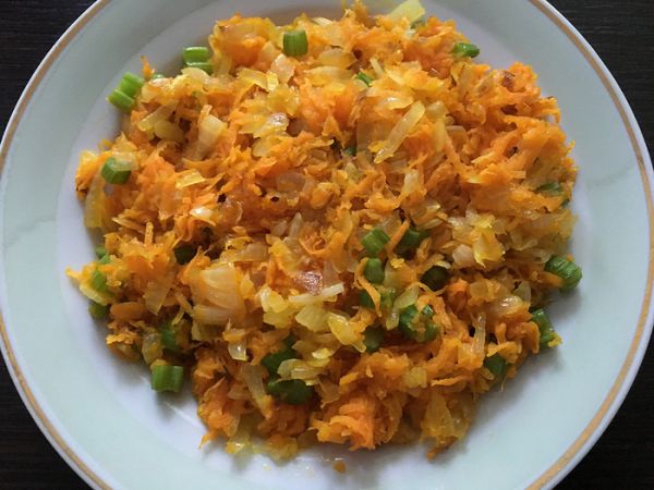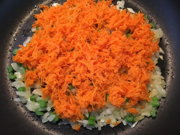 Следом отправляем морковь и пассируем все овощи до тех пор, пока морковь не станет мягкой.
