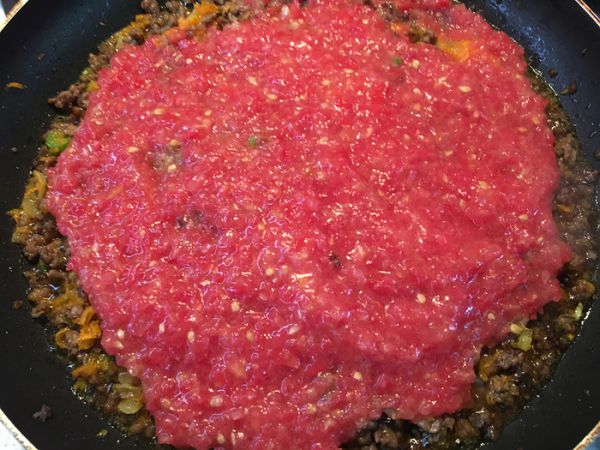 Вот теперь нужно добавлять помидоры. Конечно, подойдут и в собственном соку, но у меня таких не было, поэтому с помощью чудо-техники, именуемой как блендер, я превратил три помидорки в кашицу и отправил следом в сковородку.