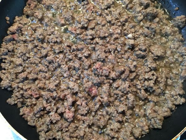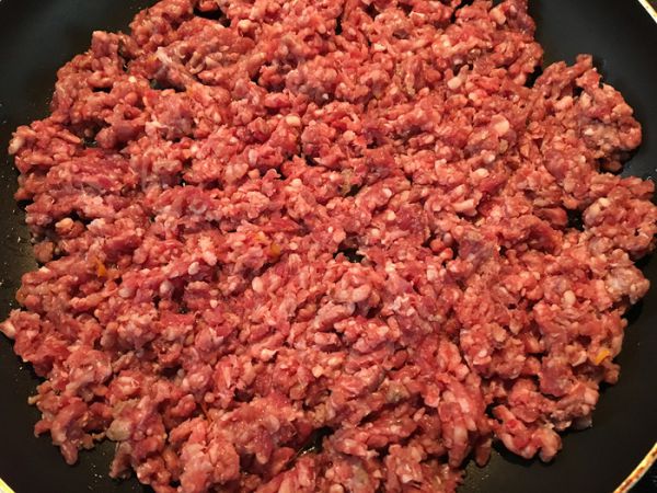 Мы снова раскаляем сковородку, выливаем столовую ложку оливкового масла и отправляем следом фарш, при этом его необходимо разбить лопаткой на мелкую фракцию.