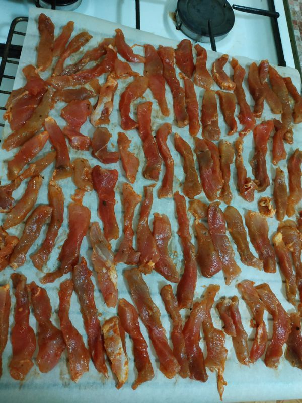Оборудование: тут вариативно, я делал в духовке, если есть сушилка для овощей, можно и в ней, наша задача дегидрировать мясо. И так приступим.