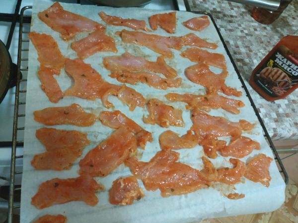 На маринаде написано, что достаточно 30 минут, но дело было в четверг, лениво было сушить, и поэтому на сутки закинул в холодильник. И так, помариновавшись сутки достаем мясо и размещаем его на противень на пергаменте. Тут две фоточки, одно с индейкой, второе со свининой. На одной как раз маринад.
