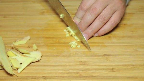 Переходим к овощам. Берем корень имбиря, очищаем его и нарезаем мелким кубиком.