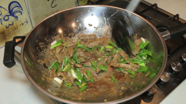 Берем сковороду. Желательно использовать вок. Разогреваем его на максимальном огне, добавив растительное масло. В раскаленное масло отправляем имбирь. Немного обжариваем, чтобы он отдал весь свой вкус маслу. Следом отправляем в вок говядину и обжариваем её в течении 3 минут на максимальном огне постоянно помешивая. Когда мясо обжарилось отправляем в вок соус, который мы приготовили ранее. Постоянно помешивая даём соусу выпариться в течении 2 минут. За это время он заметно загустеет и глазирует кусочки говядины. В самом конце добавляем зеленый лук, перемешиваем и снимаем вок с огня.