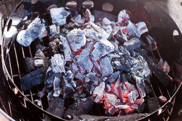Когда угли разгорелись, я насыпал на решетку для углей в коптильне еще полный стакан, и на холодные угли высыпал горячие.