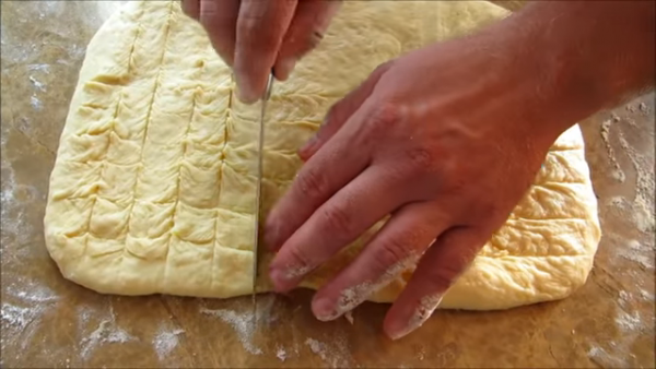 Острым ножом делаем надрезы крест на крест (шаг 1 см на 1 см).