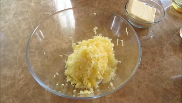 За это время картофель натрем на мелкой терке. В эту же чашку добавляем соль, растительное, сливочное масло и опару. Хорошо все перемешиваем, что бы не было комочков.